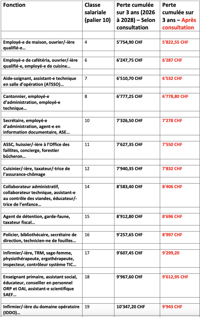 La colère est largement partagée – y compris par les personnes doutant de la grève. Pourquoi une telle colère de la base ? Evidemment il y a d’abord dans le PAFE une série de mesures qui visent à couper dans les salaires (en reportant le passage des paliers, en repoussant l’indexation des salaires à l’inflation, etc.). Le SSP a chiffré ces coupes salariales, qui montrent dans les colonnes de droite les pertes cumulées pour les différents salaires sur trois ans – et qui indiquent qu’après la consultation, la version finale du PAFE touche encore plus les salaires les plus bas !
