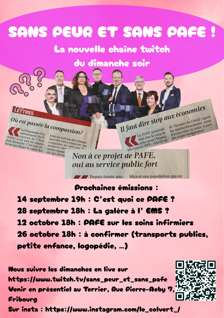 PS : au Colvert, on a décidé de lancer un stream les dimanches soirs, une semaine sur deux, sur les services publics et sur le PAFE. L’idée est de monter des émissions divertissantes où l’on invite des personnes travaillant dans les différents services publics. L’émission est filmée en direct et c’est public : venez au Terrier, rue Pierre-Aeby 7.