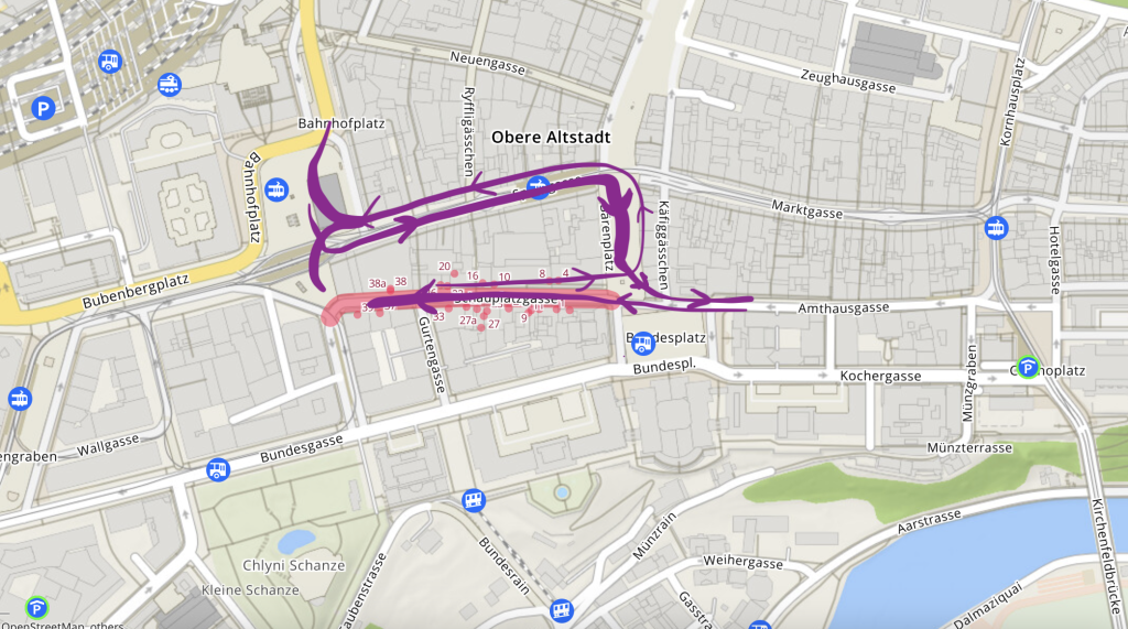 En gros : la manif est partie de la gare, par Spitalgasse, prenant à droite sur la Bärenplatz pour atteindre la place fédérale (à 1:50 on voit la police reculer sous la pression du black block).