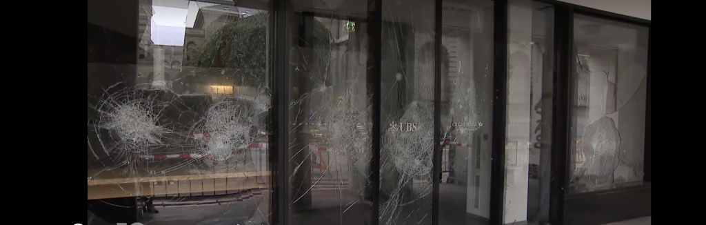 – Entre les responsables d’UBS qui décident d’investir des millions depuis le génocide dans l’une des premières entreprises israéliennes d’armement (Elbit Systems, à qui la Suisse a acheté des drones qui ne fonctionnent pas) et un groupe de potes qui profitent de la manif pour péter une vitrine UBS et dénoncer ces investissements – où sont les indiens sauvages ?
