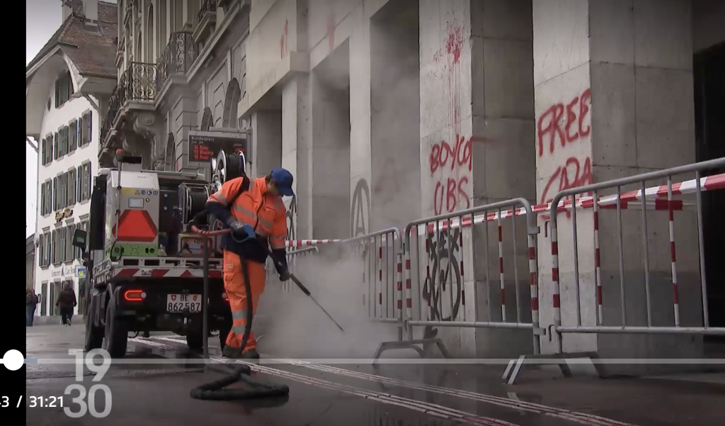 D’abord, massivement, la machine médiatique a diffusé le récit dont on parlé en intro, celui des violences commises par le méchant black block. Mettant le focus sur les images des dégradations (comme si les images parlaient d’elles-mêmes), ces produits médiatiques s’articulent globalement autour de l’idée souvent implicite selon laquelle « la violence, c’est mal » (sous-entendu : rien ne dysfonctionne dans notre régime démocratique qui puisse la justifier). Si ce type de contenus a essentiellement été diffusé en suisse-alémanique, le 19h30 en a produit un magnifique exemple.