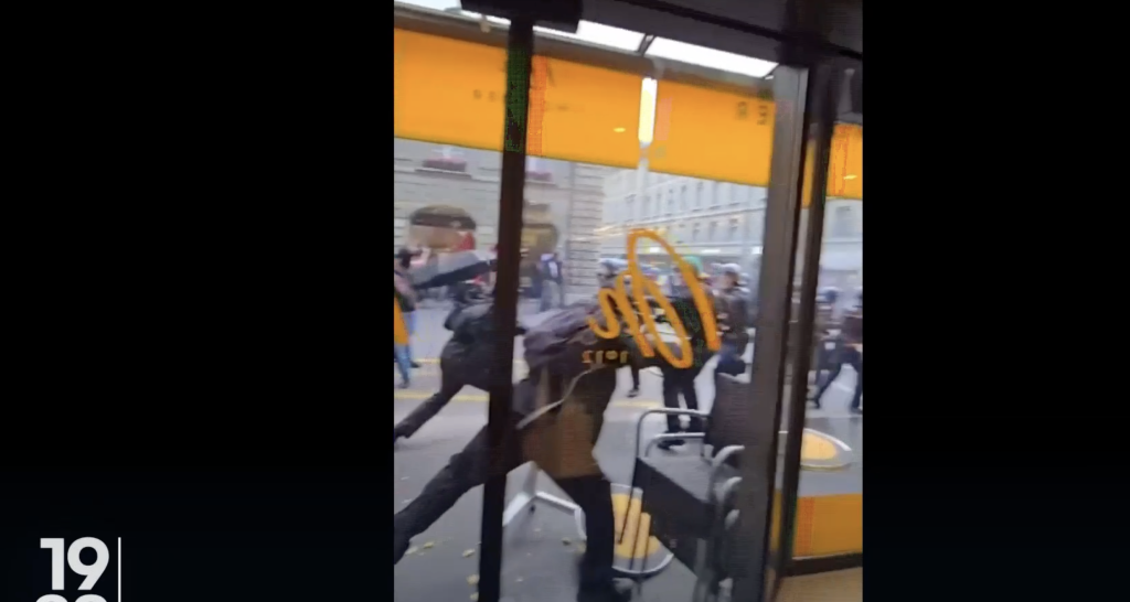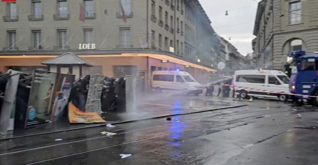 La place fédérale est largement défendue par des barrières et le block en tête de la manif cherche à poursuivre le cortège en poursuivant sur Amthausgasse. La rue est bloquée par la police, avec canon à eau et barrières : le passage n’est pas franchissable (3:35). Les premiers affrontements ont lieu ici, quand le block essaie de passer quand même, et qu’il balance des projectiles et des feux d’artifice sur la police, tout en se faisant copieusement rincer, et qu’il tague et endommage quelques devantures (c’est ici qu’ont été prises la première salve d’images des « dégradations »).